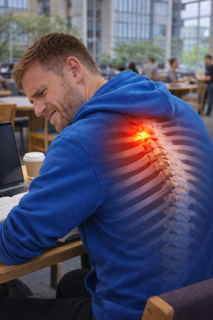 The thoracic spine is designed to move. Long periods at a laptop — especially in a rounded posture—gradually reduce that movement and increase joint stiffness.